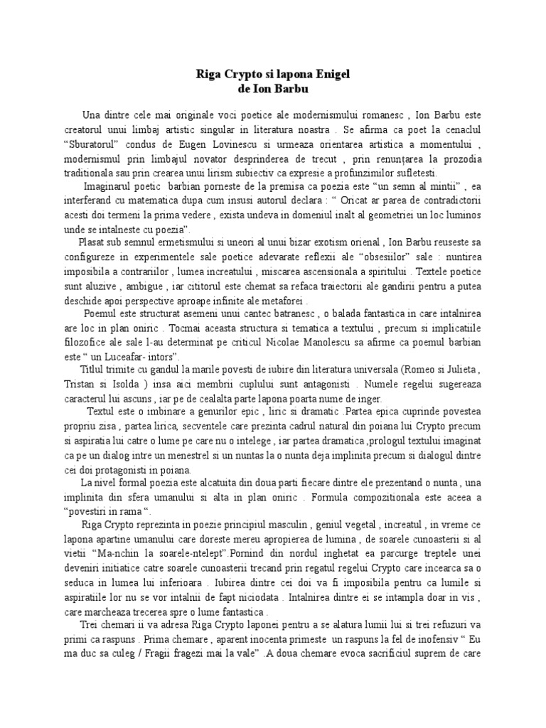 Asa cum s a remarcat daca invocatia este atat de realista plasand actiunea la spartul nuntii in camara numele stranii ale eroilor aduc un suflu exotic de usoara suprarealitate. Poezia riga crypto şi lapona enigel face parte din ciclul uvedenrode cuprins în volumul joc secund 1930 şi este subintitulată de ion barbu 1895 1961 baladă deoarece este o poveste stranie de dragoste cu aspect de cântec medieval spus de un menestrel trubadur poet şi muzicant ambulant din evul mediu cântăreţ popular ia spartul nunţii în. Poezia modernistă poezia epică. Poezia riga crypto şi lapona enigel de ion barbu face parte din ciclul uvedenrode ce aparţine volumului joc secund 1930 şi are valoare de simbol pentru creaţia poetică ulterioară.